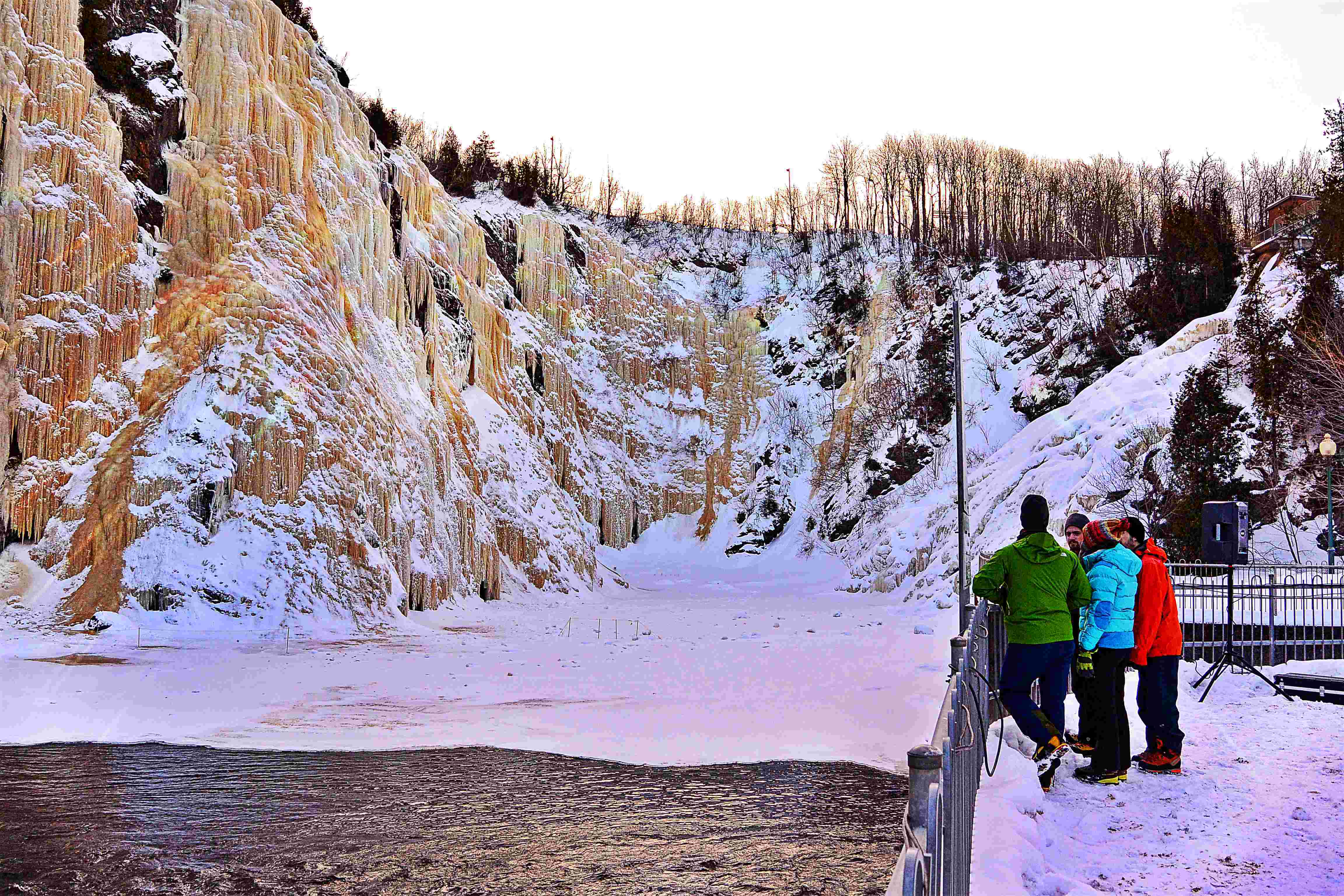 L’escalade de glace implique que des obus vont tomber du ciel. L’espace est restreint au bas des premières voies, selon la formation du plancher de glace sur la rivière. Les chutes de glace sont donc à surveiller de près lorsque tu assures, circules ou grimpes. CASQUE en tout temps.