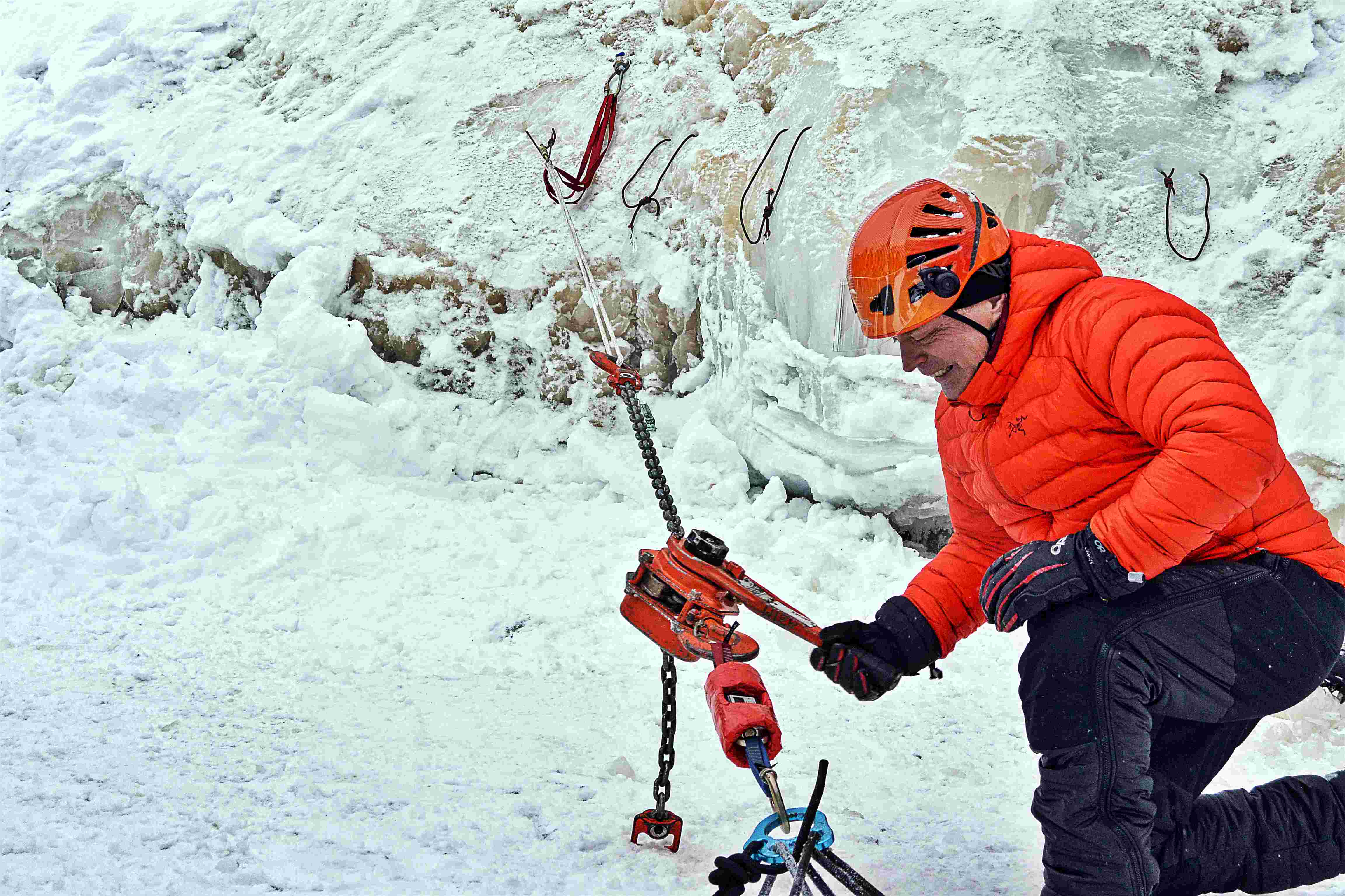 Petite apostrophe sur les ateliers de perfectionnement. Pour vrai, c’est le moment d’en apprendre un paquet sur les techniques, trucs et théories de l’escalade de glace. Un vrai « must« ! Je ne sais pas si au moment où tu liras ces lignes l’atelier existera toujours, mais celui sur la résistance des ancrages et équipements (piolets, v-thread (lunules), vis à glace) est particulièrement éclairant. Garde en tête que 1kN (kiloNewton) tient à peu près 100kg (224lbs) et tu seras rassuré de voir en personne les vrais chiffres lors des test d’équipements.